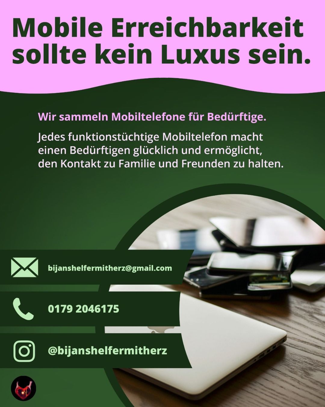Wir sammeln Mobiltelefone für unsere Klienten und Klientinnen. Viele der Menschen, die zu uns kommen (meist Obdachlose), haben kein Mobiltelefon, weil sie es sich finanziell nicht leisten können. Verträge sind aufgrund der Bonität nicht möglich. Gespendet werden können prinzipiell alle Handys, die noch gebrauchsfähig sind (auch mit Schönheitsfehlern) - am besten allerdings Smartphones, damit wichtige Dienste wie Whats App oder Internetrecherche genutzt werden können.